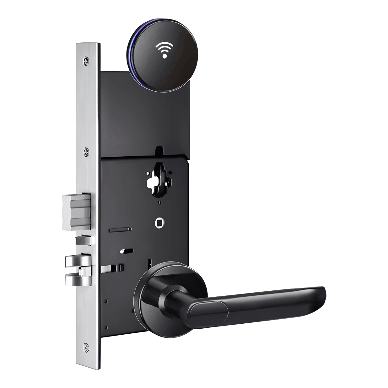 The TTLOCK HOTEL INVISIBLE is a low-cost electronic hotel-style smart lock with an invisible design and ANSI-type mortise, powered by 4×AA batteries with no wiring needed. It offers keyless access via RFID card, Bluetooth/TTHOTEL app control, and a mechanical key, locks automatically on the latch, and can integrate with hotel PMS systems in TTHOTEL mode — ideal for hotels, hostels, and rental properties seeking a reliable access control solution.